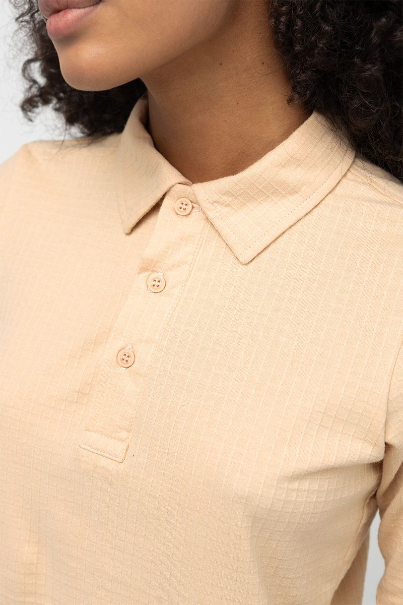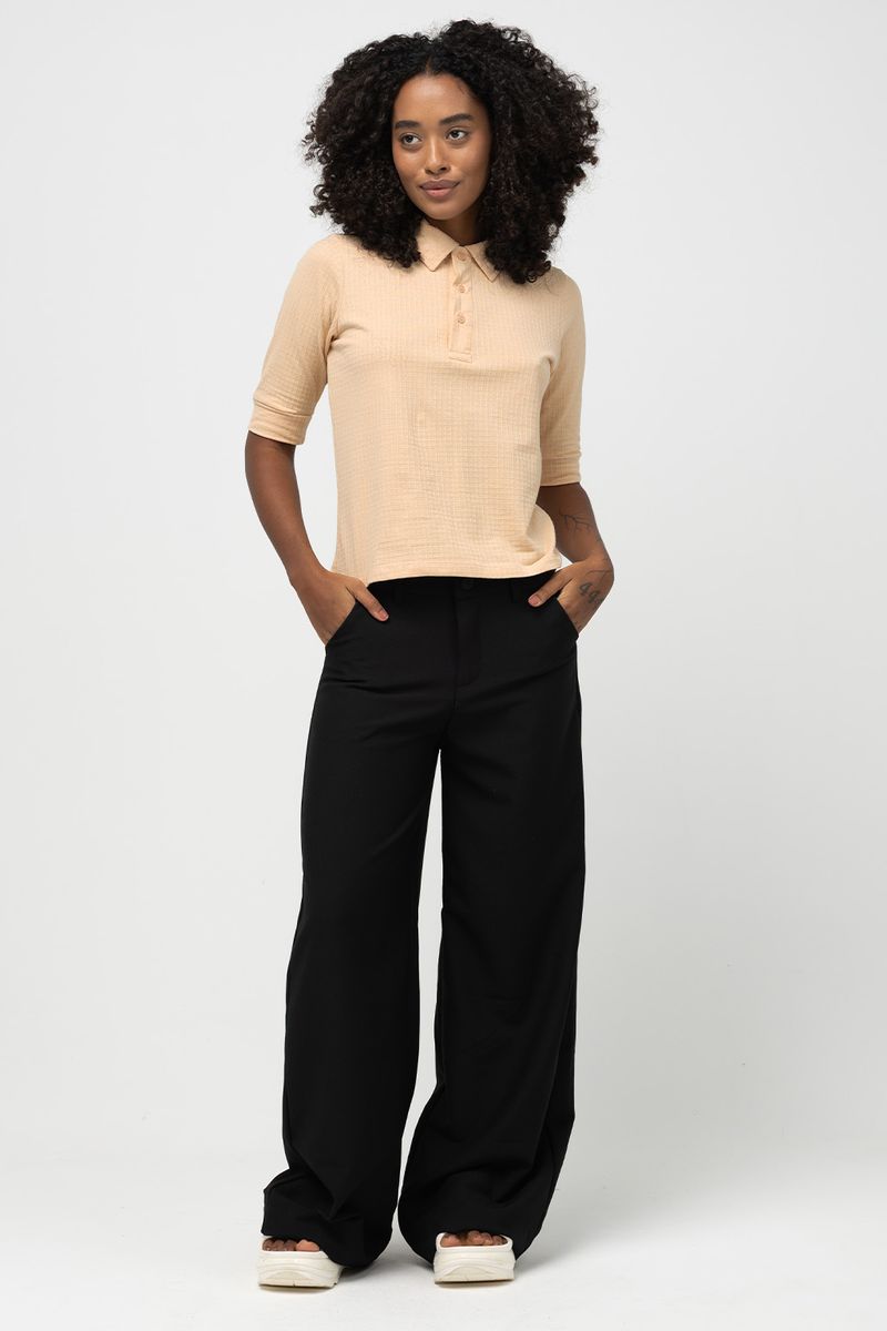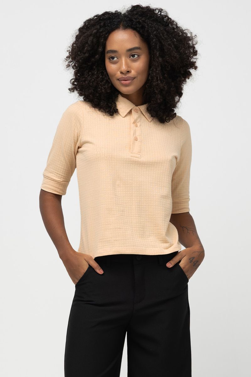 gola polo feminina, tecido diferenciada, mangas, gola com fechamento em botões. composição: 84% algodão 16% poliéster